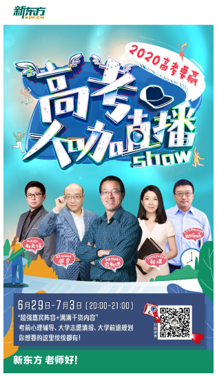 據(jù)了解,在高考公益直播課程“高考沖刺——新東方全明星考前點(diǎn)撥live課堂”圓滿結(jié)課之后,新東方在6月29日至7月3日無(wú)縫銜接了“高考大咖公益直播SHOW”,邀請(qǐng)了五位重量級(jí)大咖從人生規(guī)劃、家庭教育、大學(xué)生活、國(guó)外留學(xué)等多個(gè)層面為考生及高考家庭答疑解惑,幫助考生做好備考及升學(xué)的最后準(zhǔn)備。