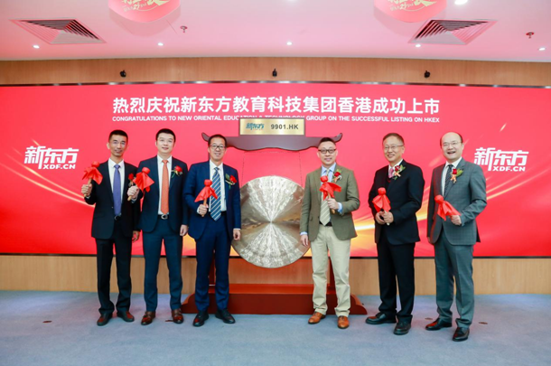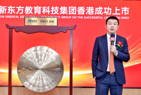 受疫情影響,新東方當(dāng)天在北京集團總部舉行了云上市儀式,新東方教育科技集團董事長俞敏洪、首席執(zhí)行官周成剛、首席財務(wù)官楊志輝、副總裁張戈、副總裁孫東旭與獨立董事楊壯,通過與香港聯(lián)交所遠(yuǎn)程連線共同完成“云敲鑼”,宣告新東方教育科技集團同時登陸中國香港和美國兩個國際化的資本市場。