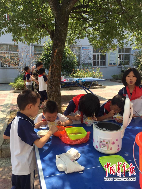 弋陽農(nóng)村小學(xué),孩子們在校園吃午飯。他們的爸爸媽媽大都在外面打工,爺爺奶奶就承擔(dān)起中午送飯的任務(wù),有的老人最多要給六七個孩子送飯。中國青年報·中青在線記者 李新玲/攝