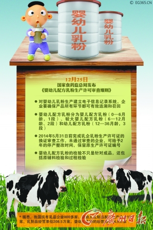 上個月末,國家食藥監(jiān)總局發(fā)布《嬰幼兒配方乳粉生產(chǎn)許可審查細則(2013版)》,這被視為“中國食品安全史上最嚴標準”。其對企業(yè)質(zhì)量安全管理、原輔料把關(guān)、配方管理、生產(chǎn)過程控制、檢驗檢測能力等9方面進行重新規(guī)定,提出更高的要求。國家食藥監(jiān)總局就此部署開展嬰幼兒配方乳粉生產(chǎn)許可有效期屆滿換證審查和再審核工作,要求各地在2014年5月31日前全部完成。對暫不能達到新細則要求、不能按時提出審查申請的企業(yè),以及未通過換證審查和再審核取得生產(chǎn)許可的企業(yè),經(jīng)省級食品藥品監(jiān)管部門批準,可給予2年的停產(chǎn)整改時間,保留原生產(chǎn)許可證編號。