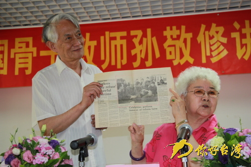 田華女士、肖老師展示人民日報英文版介紹孫敬修老人的文章(你好臺灣網(wǎng) 圖)