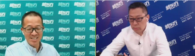 首場(chǎng)主旨對(duì)話(huà)由新東方教育科技集團(tuán)董事長(zhǎng)俞敏洪、首席執(zhí)行官周成剛以連線(xiàn)的方式展開(kāi),為本次研討會(huì)打響第一槍?zhuān)司椭形鞣浇逃町惖仍?huà)題進(jìn)行了探討。