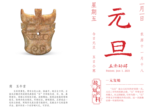 2021年《故宮日歷》青少版以“福牛賀新歲、豐年禾黍香”為主題,全書選取故宮館藏的歷代牛文物以及由牛引申出與我國農(nóng)耕文化相關(guān)的文物藏品,分別展現(xiàn)了牛迎豐年、春來牛肥、吉牛納福、耕織為本、仙牛呈瑞、牧牛意趣、丹青寫牛、百牛賀歲等豐富內(nèi)容。青少版的特色欄目——“故宮知識百科”從孩子的視角講述與“!毕嚓P(guān)的故事:從農(nóng)耕文明到自然科學,從傳統(tǒng)姓氏到人物故事,從成語典故到文學作品,展現(xiàn)“牛”這一經(jīng)典意象在華夏文化長河中的意義和內(nèi)涵,推而廣之,帶領(lǐng)青少年走進一個博大精深的文化世界。