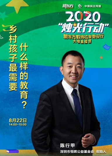 集結(jié)新東方內(nèi)外部名師大咖打造的“大咖直播課”,是今年?duì)T光行動(dòng)的一大亮點(diǎn)。8月19日至8月23日,新東方教育科技集團(tuán)董事長(zhǎng)俞敏洪,新東方教育科技集團(tuán)CEO周成剛,新東方教育科技集團(tuán)教學(xué)管理部總經(jīng)理汪珺,深圳市恒暉公益基金會(huì)創(chuàng)始人陳行甲,是光詩(shī)歌創(chuàng)始人康瑜相繼來(lái)到新東方直播間,面向廣大鄉(xiāng)村教師直播開(kāi)課。