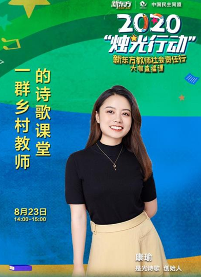 8月23日,最后一堂大咖直播課,是光詩(shī)歌創(chuàng)始人康瑜帶來(lái)“一群鄉(xiāng)村教師的詩(shī)歌課堂”主題分享。是光詩(shī)歌是國(guó)內(nèi)首家鄉(xiāng)村詩(shī)歌教育公益組織,通過(guò)為鄉(xiāng)村教師提供系統(tǒng)詩(shī)歌課程,讓偏遠(yuǎn)地區(qū)學(xué)生獲得平等的詩(shī)歌教育和自由的情感表達(dá)。