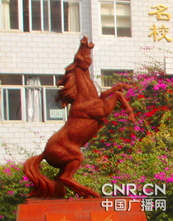 云南民族中學(xué)校長(zhǎng)李暾(左)本臺(tái)記者徐建娟(右) 主持人:很多少數(shù)民族學(xué)生聚集在這個(gè)學(xué)校里面,很有民族特色。學(xué)校的師資力量師資規(guī)模是怎樣的? 李校長(zhǎng):我們學(xué)校的師資力量應(yīng)該說(shuō)還是比較強(qiáng)的。我們有教授1人,在云南省正高教授當(dāng)中學(xué)校長(zhǎng)的就是我本人了。我們特級(jí)教師有7位,中高職稱教師占了學(xué)校教師總數(shù)的85%以上。而且我們盡量努力引進(jìn)一些優(yōu)秀少數(shù)民族教師。目前少數(shù)民族教師有16種民族,占了教師總數(shù)的32.4%。我們?cè)谂ㄔO(shè)一支“新、高、精、深、好”的教育教學(xué)教師隊(duì)伍,“新” 就是指“教育理念新”,“高” 就是“師德素質(zhì)高”,“精” 是“業(yè)務(wù)能力精”,“深” 是“民族感情深”,“好” 是“整體結(jié)構(gòu)好”。正因?yàn)橛羞@樣一支“新、高、精、深、好”的教育教學(xué)師資隊(duì)伍,我們學(xué)校才可以出現(xiàn)現(xiàn)在這種騰飛,可以說(shuō)是跨越式的發(fā)展。 主持人:的確,老師是一個(gè)學(xué)校的精神和靈魂。我們同時(shí)在學(xué)校里還可以看到各種各樣的雕塑,它們象征各種各樣的精神。就像我背后的這個(gè)騰飛的馬,李校長(zhǎng)能不能跟我們大家來(lái)介紹一下校園文化的特色?