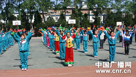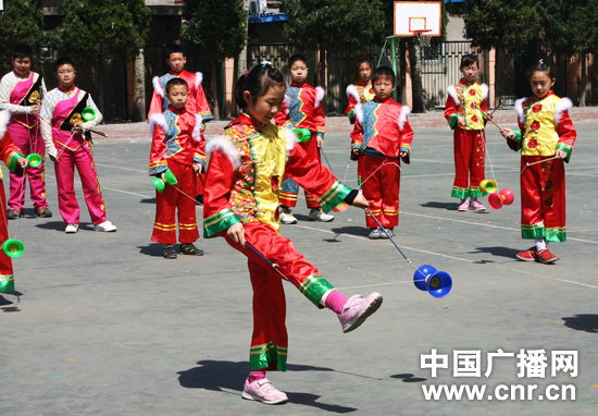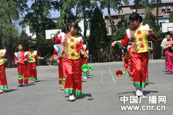 電廠路小學在深刻領(lǐng)會了“優(yōu)質(zhì)、均衡”的實質(zhì),結(jié)合十六字培養(yǎng)方針,在廣泛調(diào)查、分析的基礎(chǔ)上,將民族鼓樂、空竹確定為辦學特色(抖空竹和民族鼓樂都屬于2006年5月國務(wù)院批準文化部確定的第一批國家級非物質(zhì)文化遺產(chǎn)名錄),并得到了教委的大力扶持和專家們的熱情幫助。