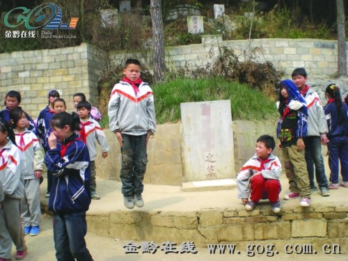 走進(jìn)學(xué)校大門(mén),迎面兩側(cè)就是三間板房,光線比較昏暗,其中一間板房的門(mén)頭上貼有一張紅紙,上面寫(xiě)著六年級(jí),里面的學(xué)生正在聚精會(huì)神的聽(tīng)老師上課,再往前走大約10米遠(yuǎn),一塊微微傾斜的場(chǎng)地(大約100平方米)就是學(xué)校的操場(chǎng),五年級(jí)的學(xué)生正在上體育課,而在操場(chǎng)右側(cè)的一小坪壩上,竟然矗立著一座大大的墳?zāi)?只有膽大的學(xué)生才敢靠近,而膽小的只能望而卻步。