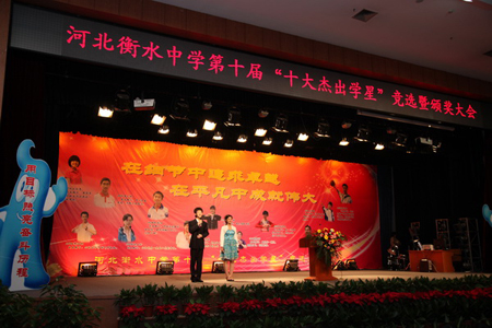 經(jīng)過現(xiàn)場評委的打分,最終,387班張慕晨、420班韓澤鵬、428班劉依慧、410班李藝超、387班李涵悅、382班趙亞玲、410班武博陽、403班王子琪、394班劉保磊、396班羅天擎十名同學(xué)榮獲衡水中學(xué)第十屆“十大杰出學(xué)星”稱號。同時,何壽媛等八名同學(xué)獲得“優(yōu)秀學(xué)星”稱號。