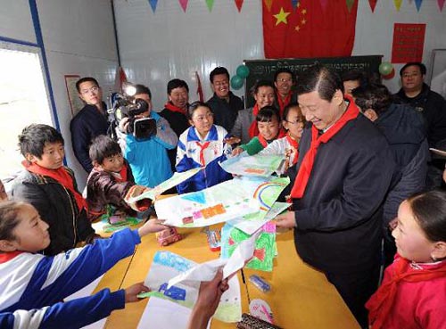 6月1日,中共中央政治局常委、中央書記處書記、國(guó)家副主席習(xí)近平專程趕赴青海玉樹地震災(zāi)區(qū),看望慰問(wèn)災(zāi)區(qū)各族干部群眾和災(zāi)后重建人員,考察群眾安置情況和災(zāi)后重建工作。這是習(xí)近平在玉樹州紅旗學(xué)!拔倚闹械男掠駱洹敝黝}繪畫活動(dòng)現(xiàn)場(chǎng),興致勃勃地欣賞學(xué)生們創(chuàng)作的兒童畫。