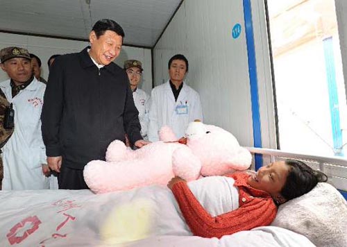 6月1日,中共中央政治局常委、中央書記處書記、國(guó)家副主席習(xí)近平專程趕赴青海玉樹地震災(zāi)區(qū),看望慰問(wèn)災(zāi)區(qū)各族干部群眾和災(zāi)后重建人員,考察群眾安置情況和災(zāi)后重建工作。這是在玉樹體育場(chǎng)濟(jì)南軍區(qū)野戰(zhàn)方艙醫(yī)院,習(xí)近平給正在接受治療的兒童送上“六一”國(guó)際兒童節(jié)禮物。