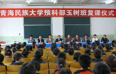 5月13日,青海民族大學(xué)預(yù)科部玉樹高中班復(fù)課儀式在嘹亮的國(guó)歌聲中舉行。青海省教育廳民教處處長(zhǎng)雅拉毛、青海民族大學(xué)黨委副書記呼斯哈力其,副校長(zhǎng)李生榮、張維平、楊發(fā)玉,宣傳部部長(zhǎng)喬文良,預(yù)科部副主任莫乃玉,社會(huì)愛心人士馬志云先生等出席復(fù)課儀式。預(yù)科部主任包錦淵同志主持會(huì)議。