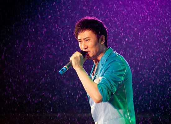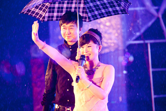 阿爾法身著紅色皮衣,英俊帥氣,激情四射,唱著《花兒為什么這樣紅》跳起了熱烈的新疆民族舞蹈。江濤用他的成名曲《愚公移山》在觀眾中掀起了一個小高潮。杭天琪上臺的時候雨已經(jīng)下大了,她為大家唱的是《黃土高坡》和《京劇臉譜》,唱完兩首歌后已經(jīng)幾乎渾身濕透,優(yōu)美的歌聲和敬業(yè)精神感動了在場的觀眾,引起陣陣掌聲。付笛生任靜最后出場,這時候雨越下越大,兩人在雨傘下唱起了觀眾熟知的《知心愛人》,這一情景再現(xiàn)了《知心愛人》的MV場景,引起了觀眾強烈的共鳴,將晚會現(xiàn)場推向了最高潮。唱完這一曲,付笛生意猶未盡,一個人唱起了《眾人劃槳開大船》,唱到激情之處扔掉了手中的雨傘,再次點燃了觀眾的熱情,現(xiàn)場出現(xiàn)了萬人大合唱。