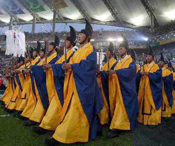 2002韓日世界杯:傾情演繹 東方神韻 2002年5月31日,第17屆世界杯開幕式在韓國漢城上巖體育場激情上演。韓國人傾情演繹的“東方神韻”令全世界人民陶醉。2300名演員共同演繹的主題為“來自東方”的開幕式文藝表演,以傳統(tǒng)的韓國民族文化和現(xiàn)代高科技把那屆世界杯開幕大戲裝扮的流光溢彩。雖然本屆世界杯為韓國、日本兩國共同舉辦,但開幕式所顯示出來的卻主要是韓國民族文化的精粹。 整個開幕式給人突出的感覺就是,韓國人用他們特有的方式歡迎著來自世界的賓客,展示出了東方燦爛的文化。與歷屆世界杯開幕式文藝表演相比,第17屆世界杯開幕式演繹出來的“東方神韻”充滿了亞洲味道,而韓國人把傳統(tǒng)文化和現(xiàn)代高科技融合到足球當中的匠心,讓全世界球迷領(lǐng)略到了韓國風采和足球魅力。