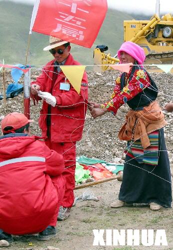 這是2003年7月7日,參與青藏鐵路藏北段建設(shè)的中鐵十五局職工與當(dāng)?shù)啬撩褚黄鹄h(huán)保警戒線。初秋的藏北草原依舊綠意盎然。如今,一條綠色“巨龍”已翻越唐古拉山,進(jìn)入拉薩河谷,而鐵路路基上移植的草皮與周圍的綠草自然和諧地融為一體……青藏鐵路建設(shè)者正在全力打造世界一流的生態(tài)環(huán)保鐵路。 新華社發(fā)