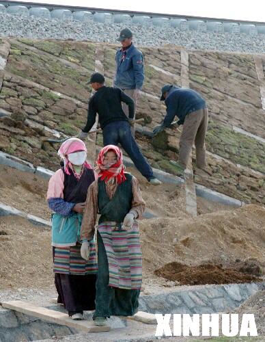 施工人員在青藏鐵路安多段進(jìn)行鐵路護(hù)坡草皮移植(攝于05年6月17日)。初秋的藏北草原依舊綠意盎然。如今,一條綠色“巨龍”已翻越唐古拉山,進(jìn)入拉薩河谷,而鐵路路基上移植的草皮與周圍的綠草自然和諧地融為一體……青藏鐵路建設(shè)者正在全力打造世界一流的生態(tài)環(huán)保鐵路。新華社發(fā)