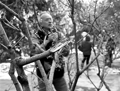 昨日,在樂(lè)農(nóng)軒門(mén)口以及附近,近20株臘梅樹(shù)都已經(jīng)開(kāi)花,十幾名游客正舉著照相機(jī)將身子湊近梅花拍照,從人群外不時(shí)能聽(tīng)到樹(shù)枝折斷的“喀嚓”聲。 北京青年報(bào)記者看到,一些開(kāi)著花的樹(shù)枝被折斷,與樹(shù)干只連著一層皮,風(fēng)一吹就四處亂晃。樹(shù)周?chē)牡厣,也散落著一些斷裂的?shù)枝。