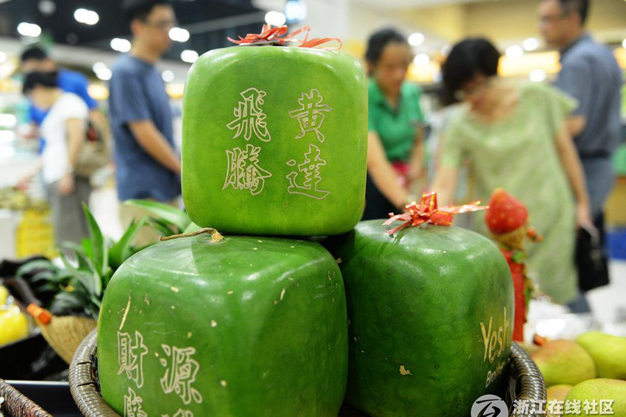 方形西瓜亮相杭州 引來顧客好奇目光