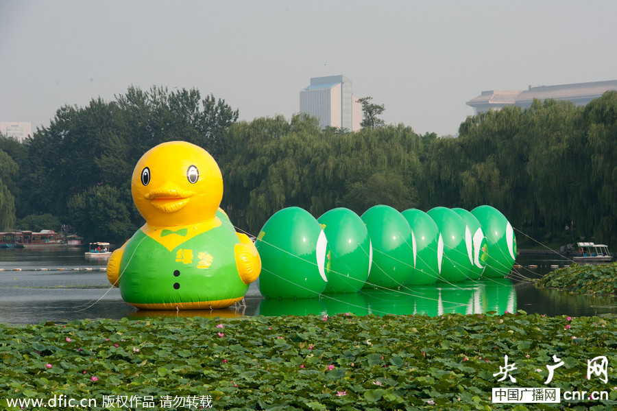 山寨大黃鴨2013年9月6日,玉淵潭公園,下蛋大綠鴨與游客見面。