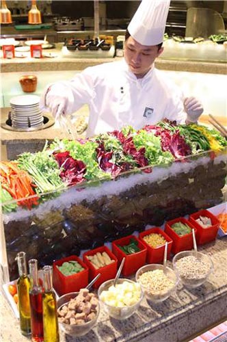 琳瑯滿目沙拉吧,所有蔬菜呈擺在清涼剔透的碎冰上,讓人內(nèi)心即刻產(chǎn)生了一種與大自然親情貼近的感覺。在蔬菜展示臺(tái)中,部分有機(jī)蔬菜整齊碼放:杏鮑菇,西紅柿,洋蔥,青椒,油菜,胡蘿卜。當(dāng)你猶豫不決不知挑選何種食材時(shí),廚師們會(huì)微笑向您認(rèn)真推薦自上海有機(jī)食品資質(zhì)公司空運(yùn)來的新鮮蔬菜:綠色水菜,紫葉生菜,紅葉蔬菜,芝麻菜和混合蔬菜。