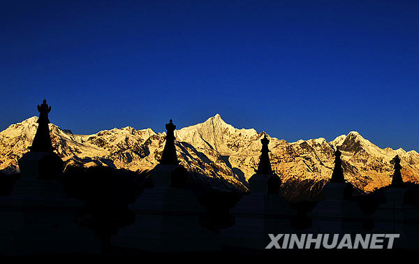 這是映襯在一排白塔之后的,日出時(shí)分的梅里雪山(11月3日攝)。新華社記者鄒崢攝