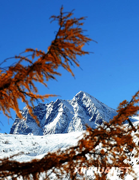 這是映襯在樹(shù)枝之后的白馬雪山的一座山峰(10月30日攝)。新華社記者鄒崢攝