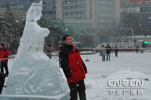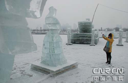 “心急”的市民冒著嚴寒與冰雕作品合影