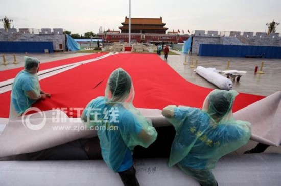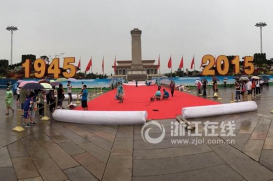 今天是北京這段時(shí)間來難得的雨天,天安門廣場也被下午開始的大雨沖洗得干干凈凈,現(xiàn)在距離9月3日紀(jì)念中國人民抗日戰(zhàn)爭暨世界反法西斯戰(zhàn)爭勝利70周年大閱兵還有4天,天安門廣場的布置已經(jīng)基本準(zhǔn)備就緒。