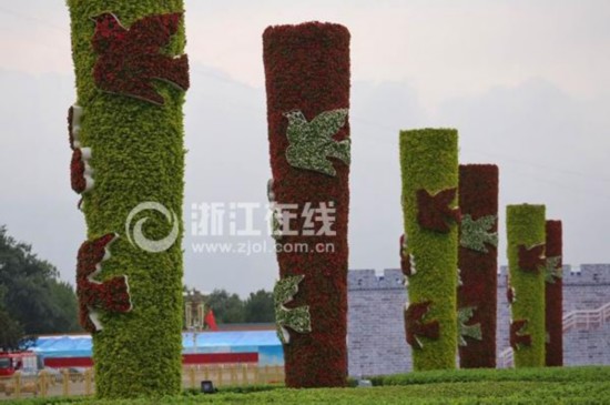 從革命英雄紀(jì)念碑到升旗臺正在鋪設(shè)紅地毯,紅地毯的兩邊是27日剛剛擺設(shè)完成的“長城”主題花壇。據(jù)了解,長城烽火臺的主景完全是用植物搭建而成,底座則由花卉、松柏和景觀石組成,其上分別立有“1945”和“2015”兩個(gè)年份。在“1945”的花壇上,有一群白鴿雕塑,寓意世界和平。