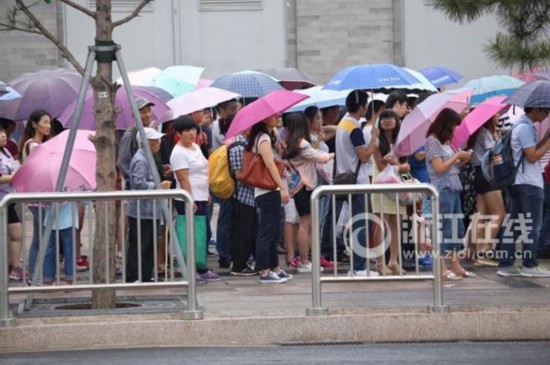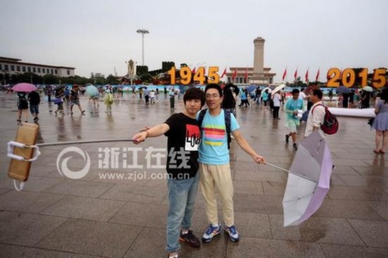 今天上午,北京市氣象臺發(fā)布了暴雨藍(lán)色預(yù)警。從下午5點(diǎn)開始,陣雨就時(shí)不時(shí)澆在天安門廣場上,可這并不影響游客們提前來天安門廣場觀賞的興致。記者看到有一家五口人從重慶趕來,就是為了看一下天安門廣場的布置,他們告訴記者,閱兵那天肯定只能在電視上看看,所以趁著這個(gè)周末,帶著孩子來北京,看看閱兵之前的北京到底什么樣。