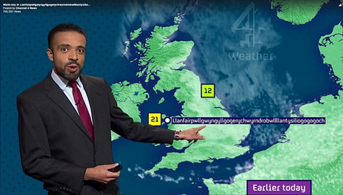 報(bào)道稱,當(dāng)天,英國(guó)電視4頻道正在播放天氣預(yù)報(bào),而預(yù)報(bào)員利亞姆·達(dá)頓正像往常一樣熟練地為觀眾們做出報(bào)道。 可就在這時(shí),畫面切換到全英溫度最高地區(qū),屏幕上赫然寫著威爾士的“Llanfairpwllgwyngyllgogerychwyrndrobwllllantysiliogogogoch”將達(dá)21攝氏度。不,你并沒有看錯(cuò),這并不是電視臺(tái)的技術(shù)故障。這是一個(gè)真實(shí)存在的,具有58個(gè)字母的地名。