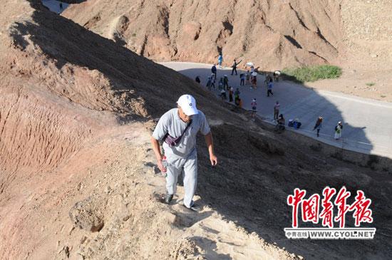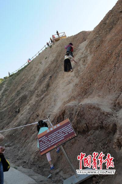 薄薄一層土,形成時(shí)間至少需要60年,但一腳下去就毀于一旦,丹霞地貌彩色丘陵的美譽(yù)也受到損傷。記者當(dāng)天看到,有不少小孩由于淘氣踩上表層土,想翻過小山丘,一旁的家長(zhǎng)無動(dòng)于衷、不加干涉。還有老者,直接從山頂?shù)挠^光平臺(tái)翻出,兩側(cè)山壁陡峭,把自身安全和土壤保護(hù)完全置于腦后。