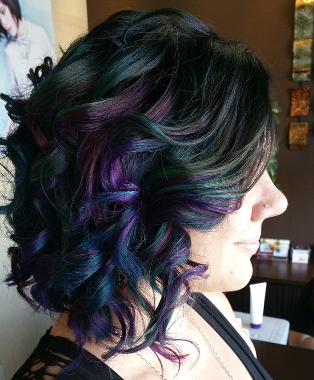 這種染發(fā)技術(shù)將紫色、藍色和綠色染在深色頭發(fā)上,達到油亮艷麗的效果,像鴨子的羽毛一樣,所以也叫“鴨毛頭”。據(jù)發(fā)型師奧拉介紹,這一發(fā)型的靈感來自雨后地上的石油,在陽光的照耀下波光粼粼,很是漂亮。