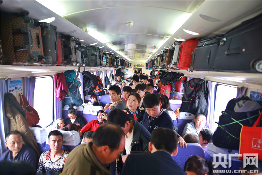 2016年3月1日廣州,廣州至烏魯木齊南的T135次列車(chē)3號(hào)硬座車(chē)廂滿(mǎn)載旅客,過(guò)道上站滿(mǎn)旅客,目測(cè)此車(chē)廂超員率超過(guò)50%。列車(chē)乘務(wù)員程春梅在車(chē)廂內(nèi)檢查行李擺放情況。(張永恒攝)