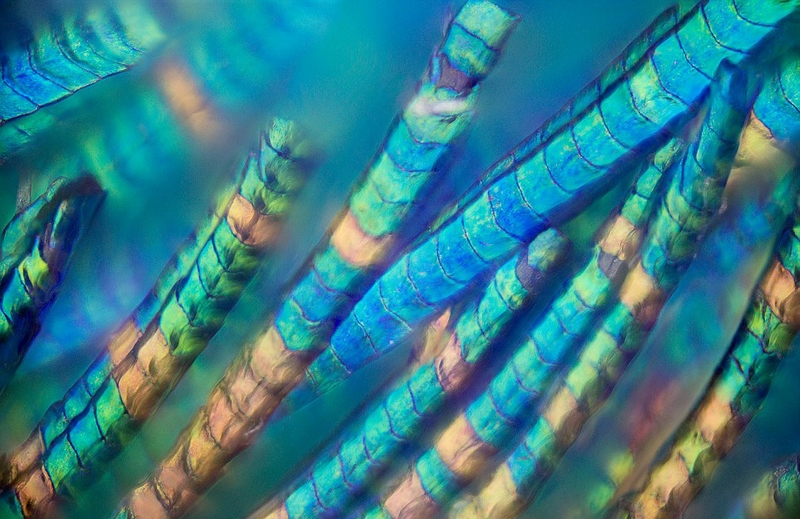 近日,加拿大軟件工程師和攝影師內(nèi)爾將佳能Rebel T3i安裝在奧林巴斯BX53顯微鏡之上對孔雀的羽毛進行拍攝。鏡頭下的孔雀,其五顏六色的散羽如交織在一起的珠寶般絢爛奪目,難怪孔雀對其羽毛引以為傲。