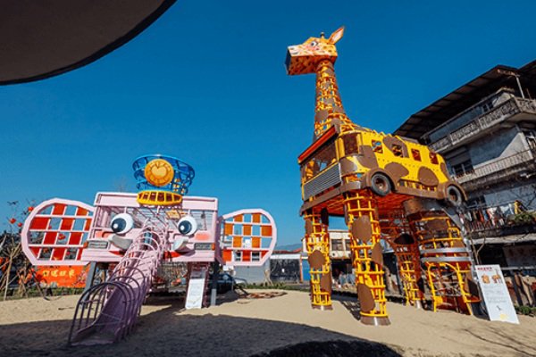戶外設有大象溜滑梯、長頸鹿嘹望臺等裝置藝術。(圖片來源/宜蘭幸福轉運站)