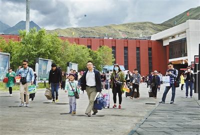 圖為從拉薩火車(chē)站走出來(lái)的旅客。(本報(bào)記者 唐斌 攝)