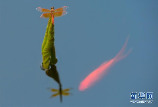 杭州西湖錢王祠門前荷塘里的錦鯉與蜻蜓(8月29日攝)。 新華社記者 尹棟遜 攝 圖片來(lái)源:新華網(wǎng)