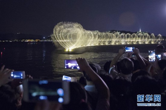 8月24日,游客在西湖邊欣賞西湖音樂(lè)噴泉。 新華社記者 鞠煥宗 攝 圖片來(lái)源:新華網(wǎng)