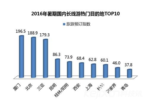 同程旅游暑期出游預(yù)訂數(shù)據(jù)顯示,廈門、北京、三亞、昆明、桂林/陽朔、西安、上海、桂林、張家界、青島是今年暑期最熱門的十個(gè)目的地,與往年的情況基本一致。7月份作為暑期旅游的“上半場(chǎng)”,熱門目的地主要集中在海濱城市等親水、避暑資源豐富的地區(qū),8月份作為“下半場(chǎng)”,秋游主題線路迅速升溫,內(nèi)蒙古、黑龍江、成都、九寨溝等出游人數(shù)明顯上升。