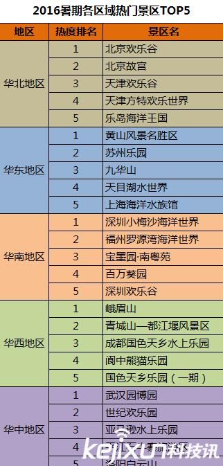 具體到各個(gè)區(qū)域,暑期華北地區(qū)最熱門的五個(gè)景區(qū)為:北京歡樂谷、北京故宮、天津歡樂谷、天津方特歡樂世界、樂島海洋王國(guó);華東地區(qū)最熱門的五個(gè)景區(qū)為:黃山風(fēng)景名勝區(qū)、蘇州樂園、九華山、天目湖水世界、上海海洋水族館;華南地區(qū)最熱門的五個(gè)景區(qū)為:深圳小梅沙海洋世界、福州羅源灣海洋世界、寶墨園?南粵苑、百萬葵園、深圳歡樂谷;華西地區(qū)最熱門的五個(gè)景區(qū)為:峨眉山、青城山—都江堰風(fēng)景區(qū)、成都國(guó)色天鄉(xiāng)水上樂園、閬中熊貓樂園、國(guó)色天鄉(xiāng)樂園(一期);華中地區(qū)最熱門的五個(gè)景區(qū)為:武漢園博園、世紀(jì)歡樂園、亞馬遜水上樂園、平江石牛寨旅游區(qū)、洛陽白云山。