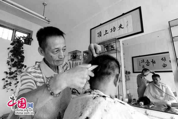 中國網(wǎng)9月7日訊 位于寧夏回族自治區(qū)銀川市興慶區(qū)寶豐巷北端,有一間面積不大的傳統(tǒng)理發(fā)店——“大光明”,店主叫楊建林,這已經(jīng)是他從事理發(fā)行業(yè)的第45個年頭了,每天一大早6點剛過就開門營業(yè)。
