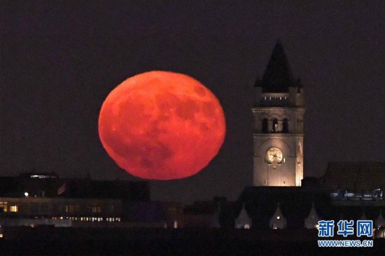 10月16日,在美國華盛頓,一輪明月從老郵局大樓上空升起!俺壴铝痢笔侵冈虑蜻\行到軌道上最接近地球的點的同時,正好是滿月。這時的月亮會比平?瓷先ジ。 新華社記者殷博古攝