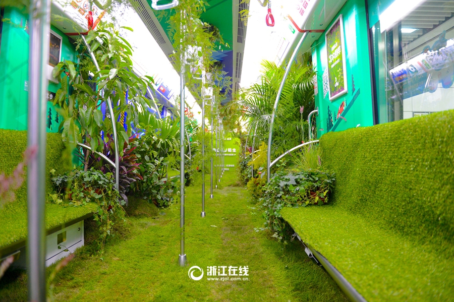 28日,杭州地鐵發(fā)生了一件大事!杭州地鐵一號線的某輛列車竟然把大自然“搬進(jìn)”了車廂里。一幕幕的綠色植物,帶著泥土的氣息,仿佛穿越到了世外桃源。將森林種在地鐵里,當(dāng)屬國內(nèi)地鐵的首次創(chuàng)意嘗試,通過城市森林,共同向人們傳遞了綠色又低碳的理念。據(jù)悉,這輛“森林”列車僅在28日上午對市民開放半天,開放時(shí)間如此短,著實(shí)讓人大呼遺憾。(浙江在線記者 于詩奇 攝)