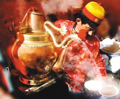 吃了這么多甜的咸的,逐漸就會(huì)讓人覺得口干舌燥。這時(shí)您不妨試試?yán)媳本┑摹八拇蟛琛薄筒琛⒚娌、茶湯,還有《紅樓夢(mèng)》中賈母所鐘意的杏仁茶。這“四大茶”吃的時(shí)候都是用滾開的水現(xiàn)沖開,最后再依據(jù)個(gè)人喜好撒上山楂塊、青紅絲、瓜子仁等果料。熱乎乎的一碗下肚,就算迎著北風(fēng)也能讓人立刻暖和起來。