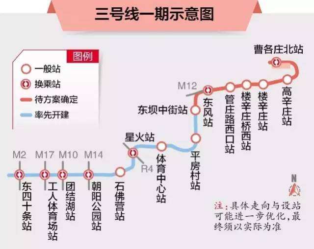 北京地鐵3號線一期工程西起東四十條,東達東壩地區(qū)的曹各莊,全長共計21公里,途中共設(shè)15座車站。目前已開工的有工人體育場站、朝陽公園站和東壩中街站。