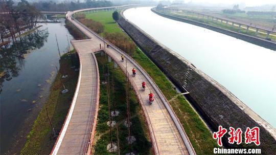 據(jù)了解,郫都區(qū)的三道堰水資源得天獨(dú)厚,都江堰內(nèi)江的兩大支流——柏條河、徐堰河縱貫鎮(zhèn)域全境,同時(shí),這兩條河在三道堰的青杠村匯成府河,流向成都市區(qū),這里也是成都重要的飲用水源保護(hù)地和府河之源。為切實(shí)保護(hù)成都飲用水源,郫都區(qū)投資2600萬元在徐堰河畔打造了一個(gè)田園和水源結(jié)合的特色濕地公園,為防止水體污染,采取架空的設(shè)計(jì)方式,將人行“綠道”建在濕地公園之上,形成一條獨(dú)具特色的空中“綠道”。