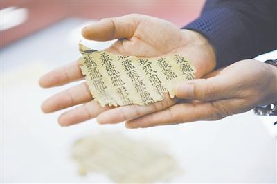 修復(fù)師向記者展示即將修復(fù)的一頁西夏文古籍,據(jù)估測(cè)距今有500多年的歷史。