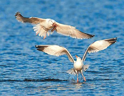 唐山市南湖龍泉寺東側的湖面上,兩只海鷗正嬉戲覓食。記者史自強攝影報道