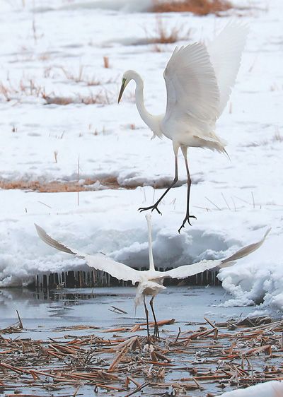 而在新疆哈巴河縣阿克齊濕地,雖然大面積的濕地還被茫茫積雪覆蓋,但在春風的吹拂下,部分河面已開始解凍。20日清晨,多只白鷺在剛開始解凍的濕地覓食,嬉戲。